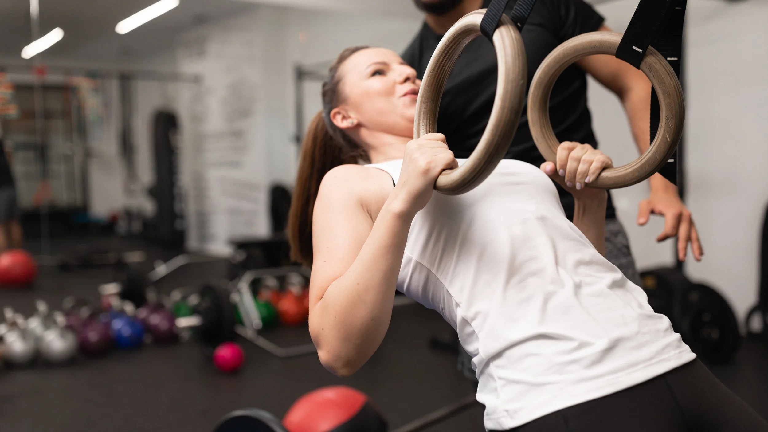 Woman performing a pull-up exercise on gymnastic rings while a trainer assists in a gym setting with kettlebells in the background.